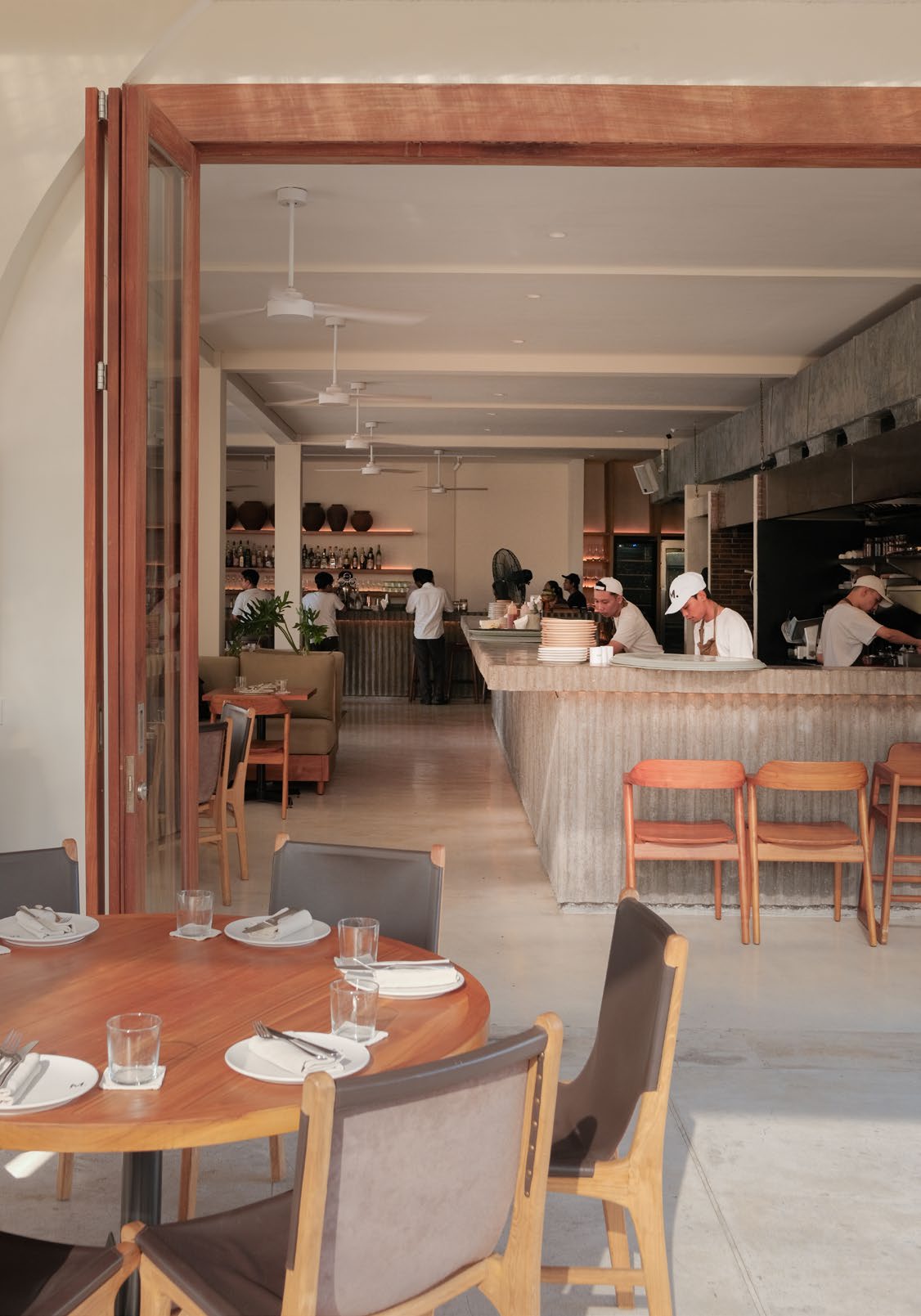 The setting is casual yet polished—natural stone walls, dark wood tables, and open-air dining that captures the Balinese breeze.